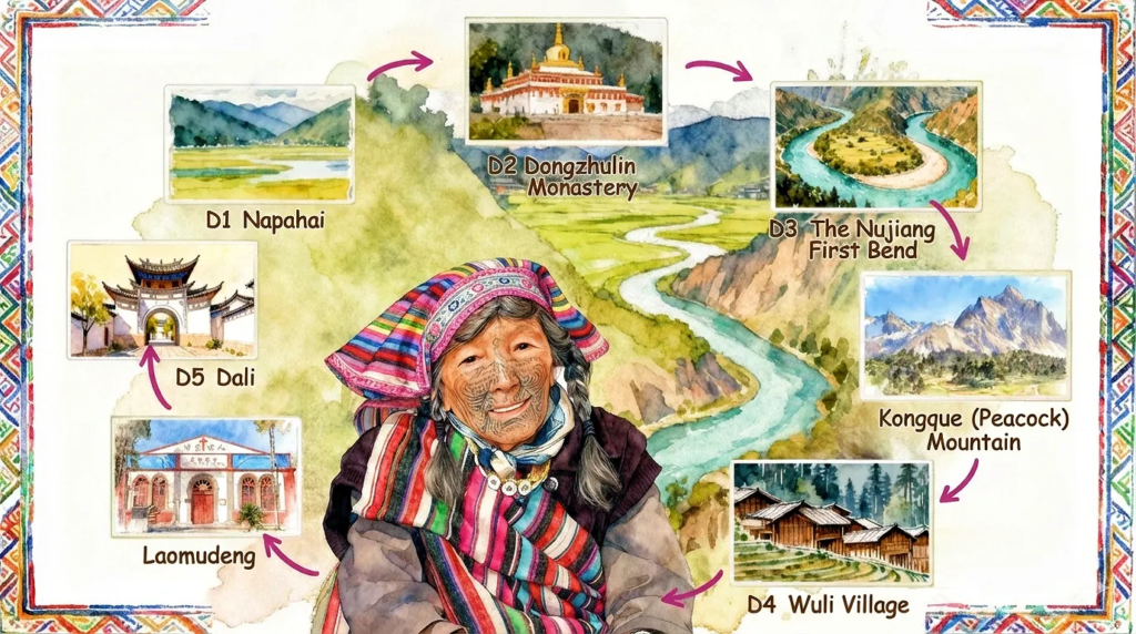 Cross into the mythical Land of Dulong’s God, an alpine wetland at 3,390 meters where snowmelt-fed marshlands transform with each season. Finally, arrive in Dulongjiang—”the last pure land on China’s southwestern frontier” and sole homeland of the Dulong people, a living museum of ethnic culture hidden between the Gaoligong and Dandanglika mountain ranges.