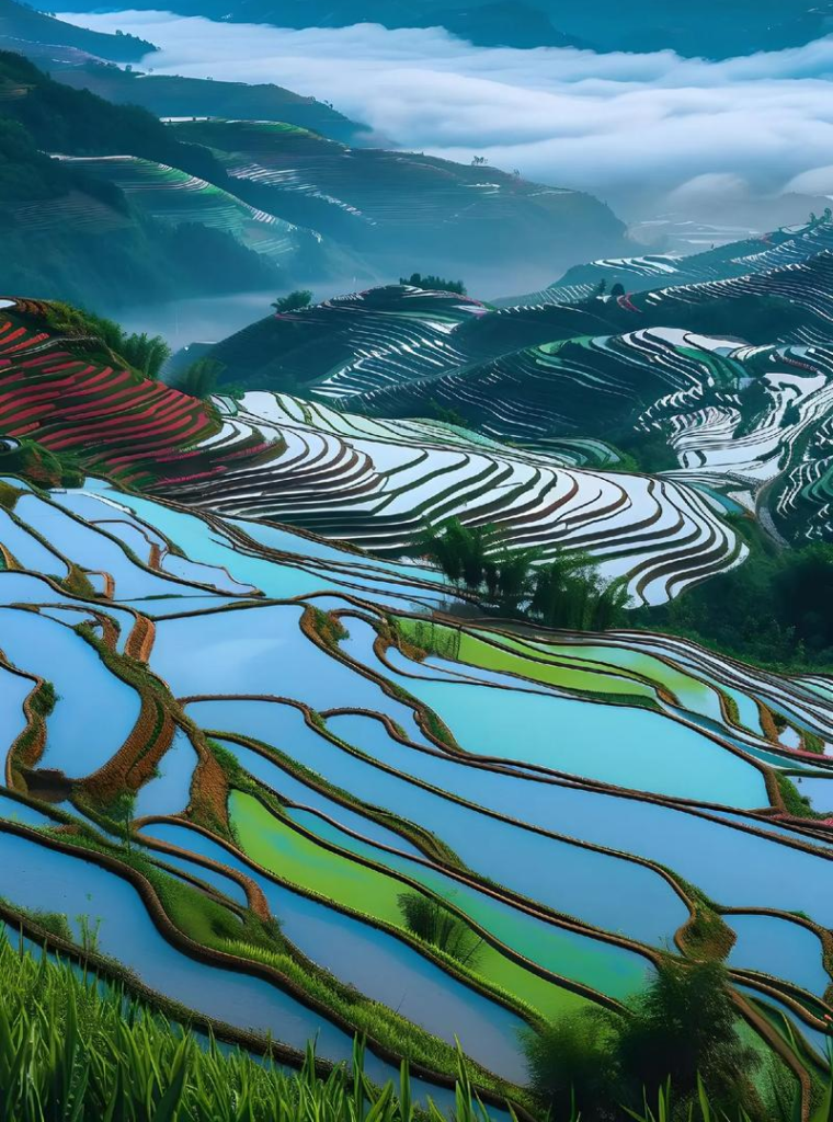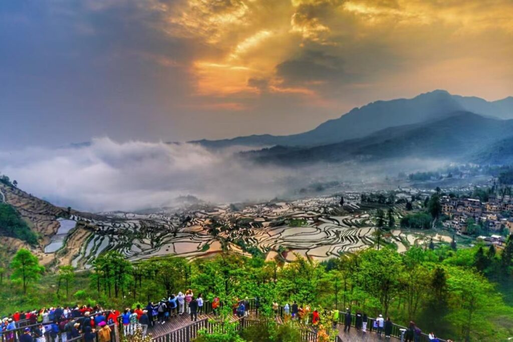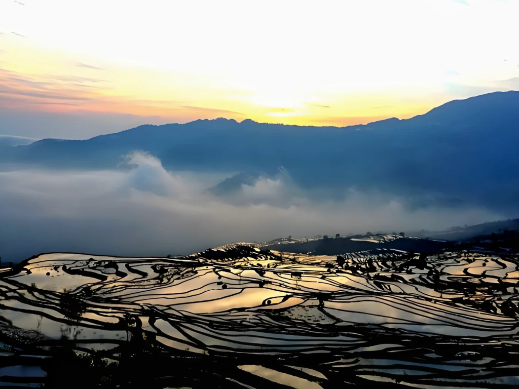 Over 1,300 years ago, the Hani people carved the Yuanyang Rice Terraces into the Ailao Mountains, creating one of the world’s most spectacular agricultural landscapes. This UNESCO World Heritage Site spans over 12,000 hectares across steep mountain slopes, forming a breathtaking mosaic.