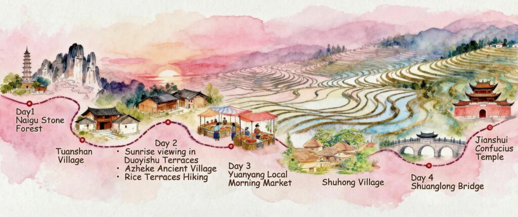 World Heritage & Natural Wonders: Explore dramatic limestone formations at the Stone Forest, witness the majestic Meili Snow Mountain, and experience sunrise over the Yuanyang Terraced Rice Fields—a breathtaking UNESCO site.